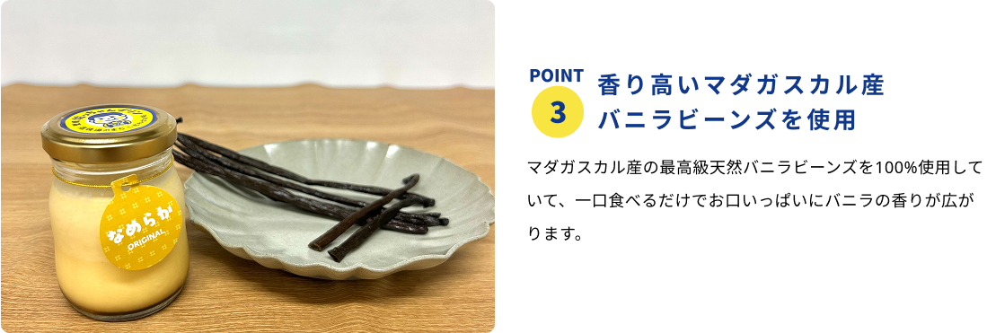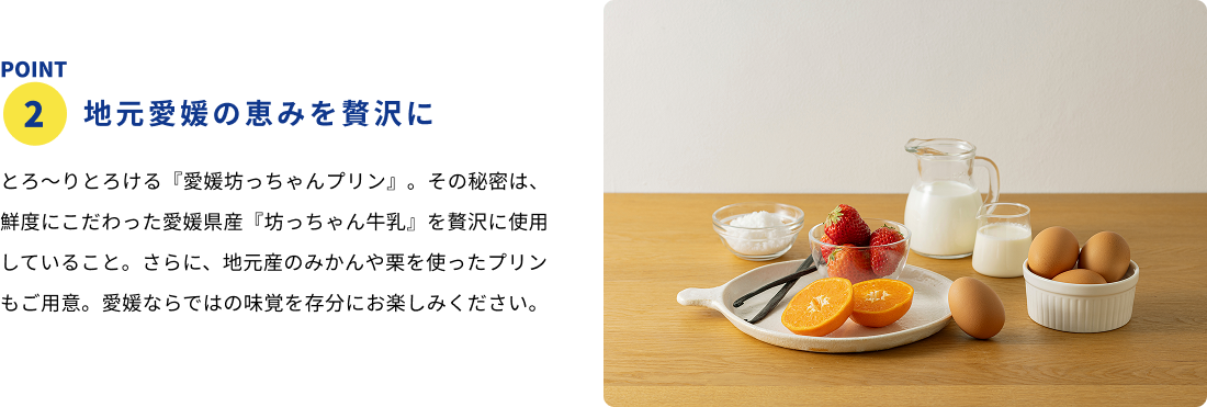牛乳(愛媛県製造)、生クリーム、卵黄、砂糖、カラメル、バニラビーンズ(一部に乳成分・卵を含む)